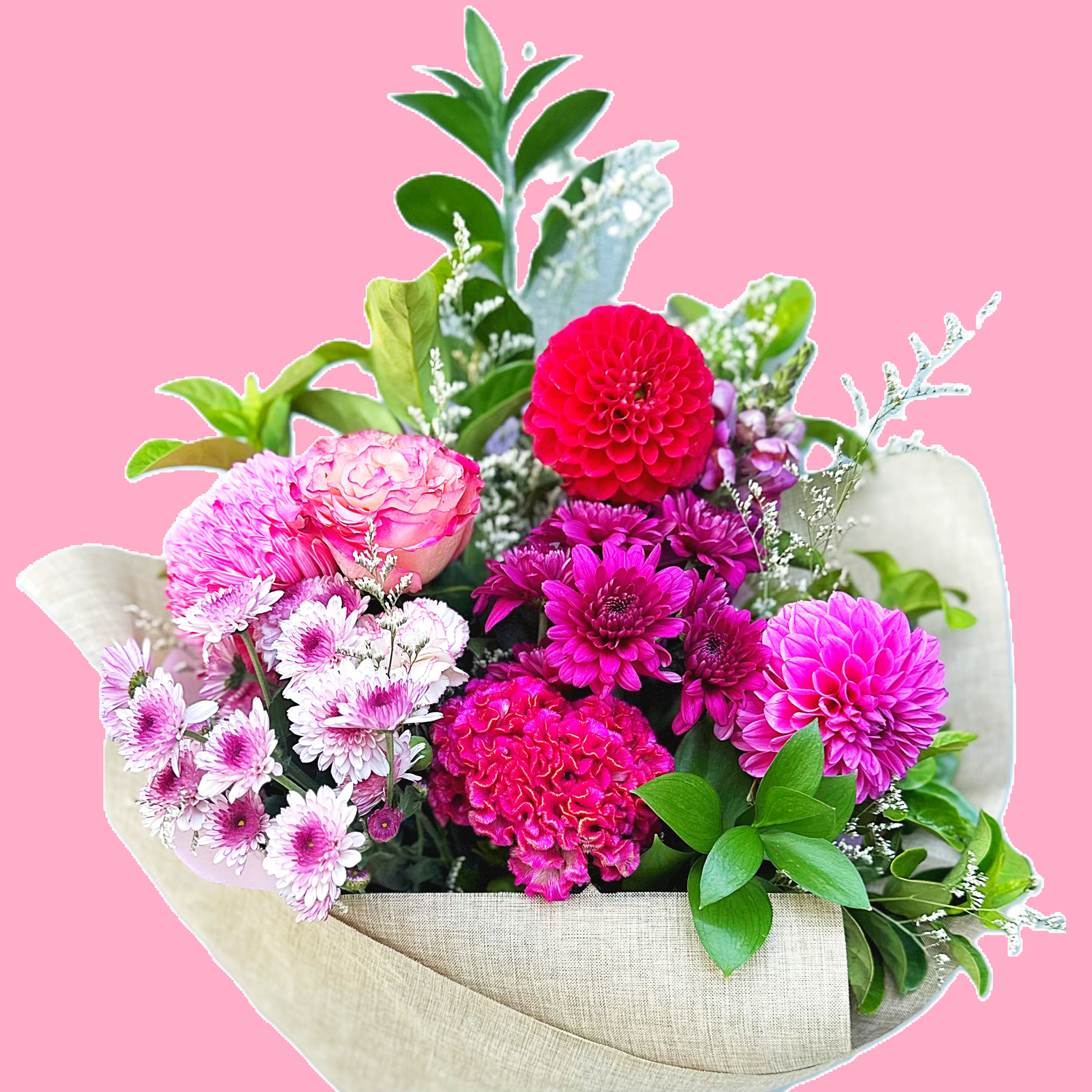 Our Raspberry Rosé bouquet features a lush mix of pink dahlias, roses, chrysanthemums and seasonal blooms, arranged in a relaxed garden style with fresh greenery. This bold and joyful pink bouquet is ideal for birthdays, celebrations, anniversaries or gifting just because.