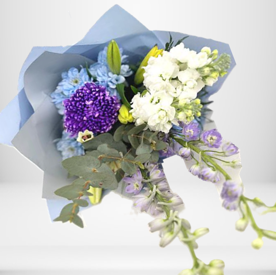 Fresh and soft elegance mixed with striking purple tones. This bouquet is perfect for celebrating birthdays, new baby and special events. Brighten someone's day with a cool, calming colour palette.