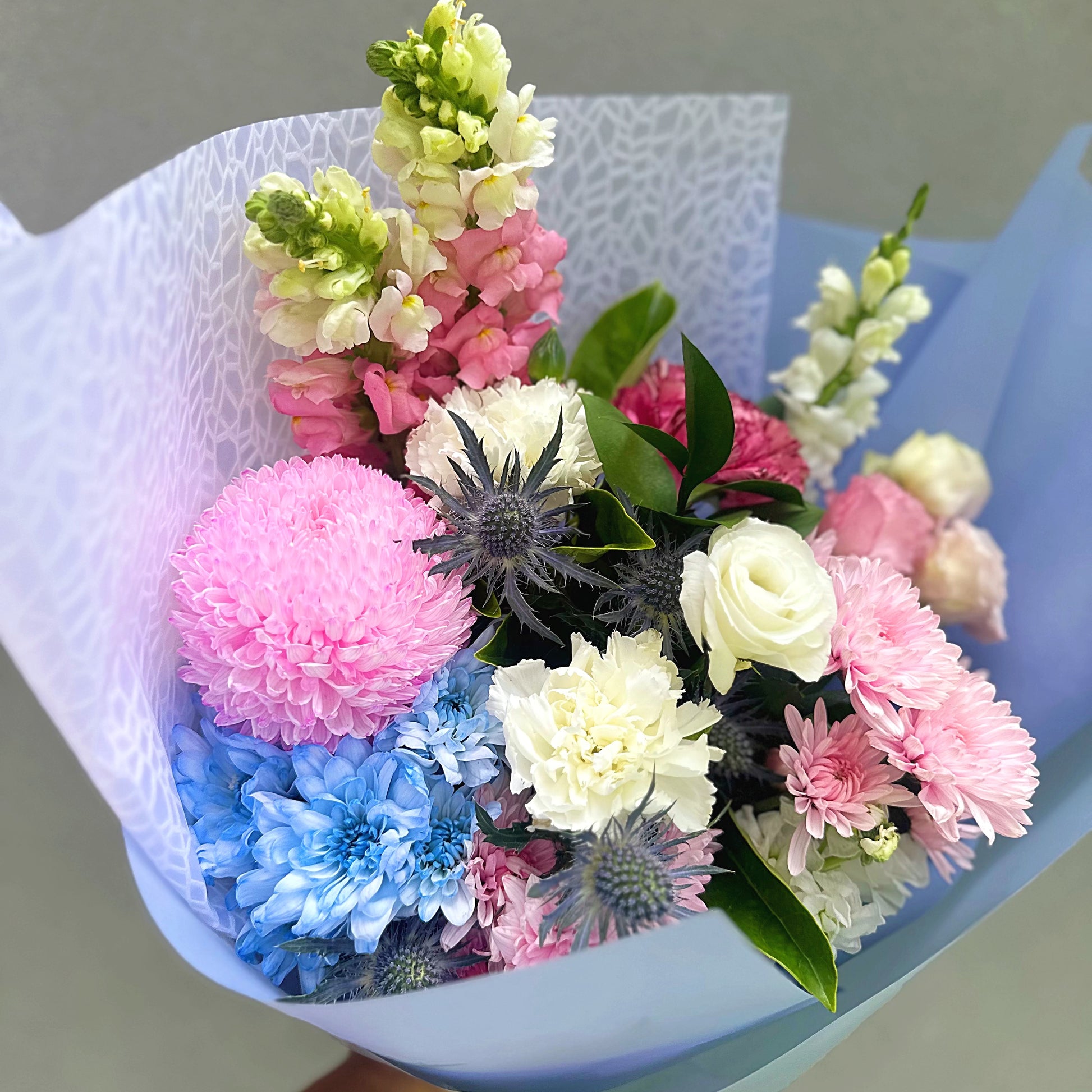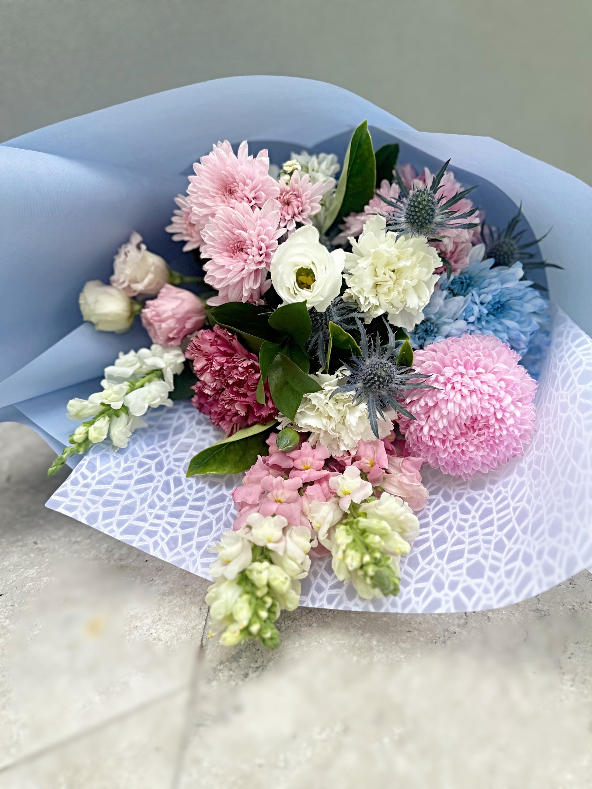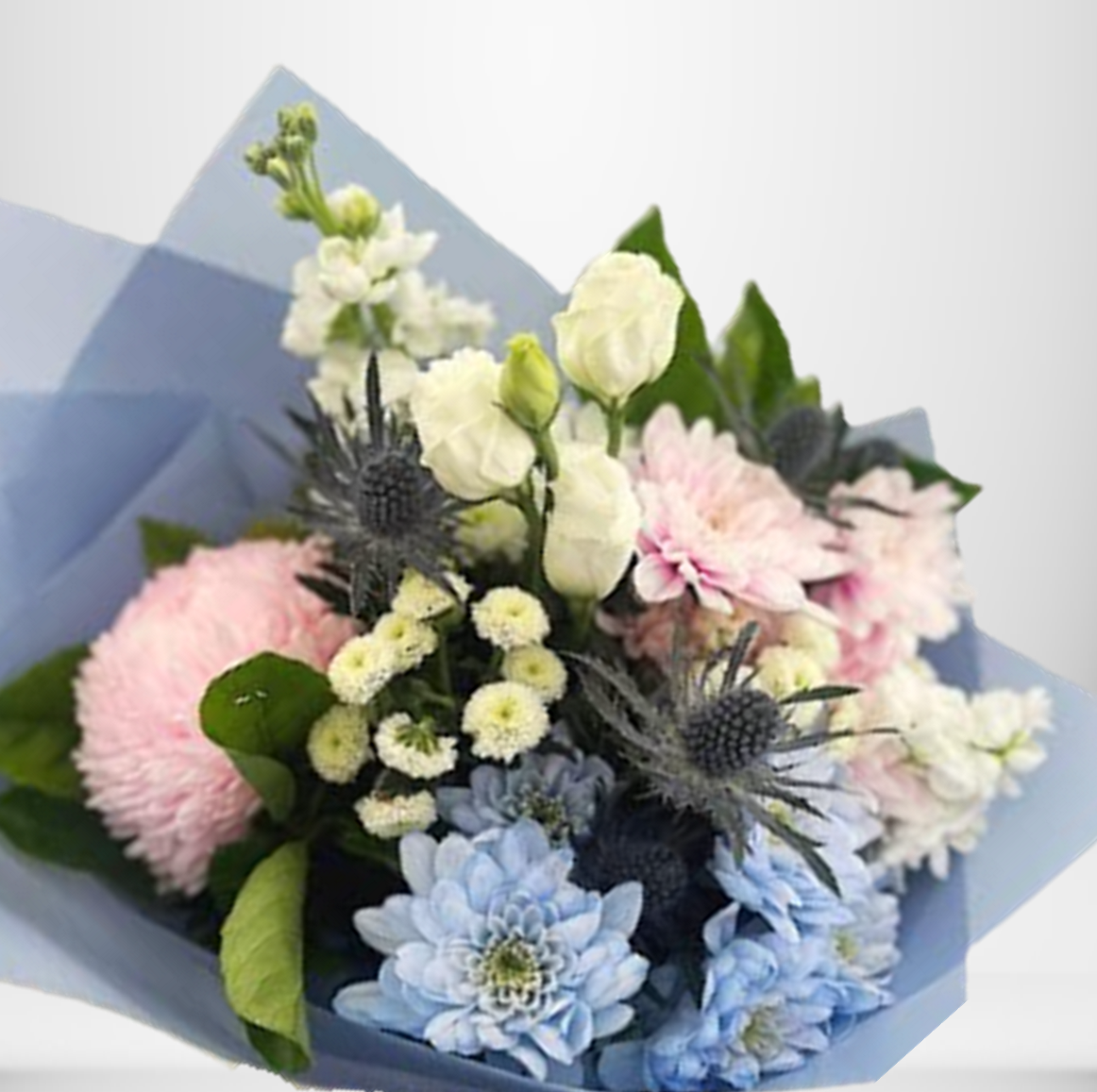 A dreamy pastel arrangement combining soft pinks, baby blues and creamy whites, Our Marshmallow Cloud bouquet will add sweetness to any occasion.