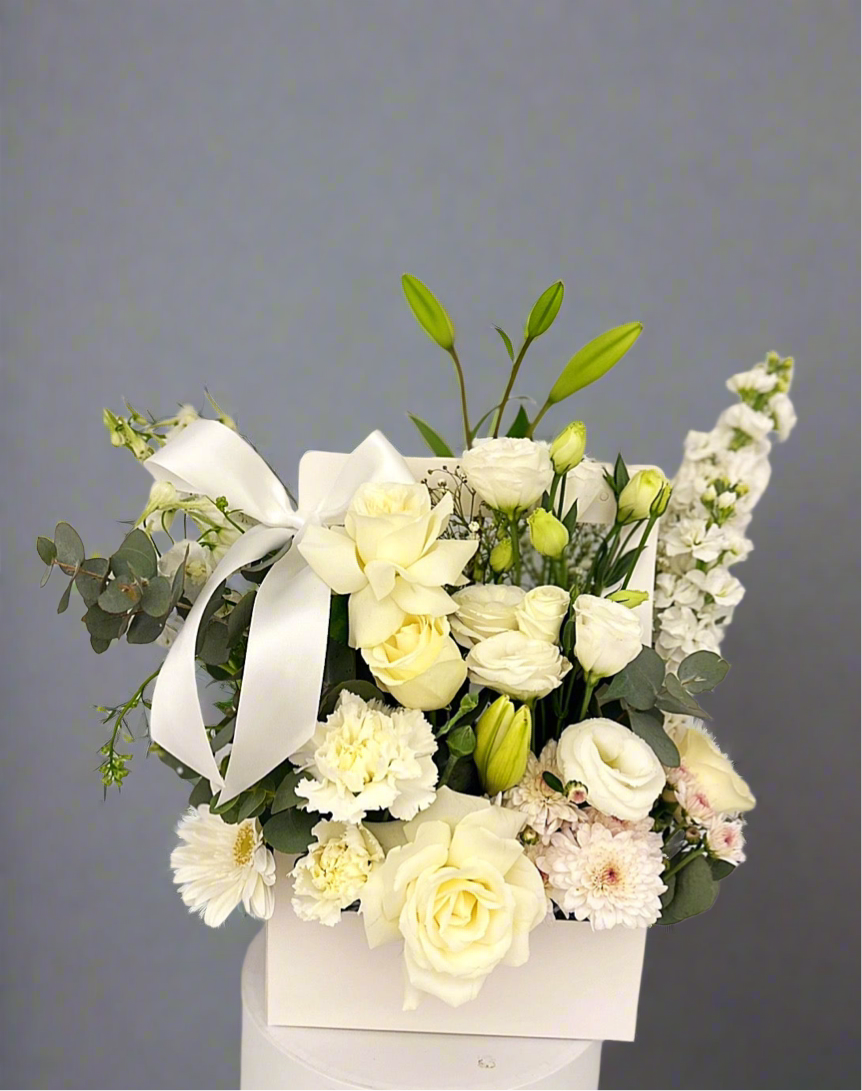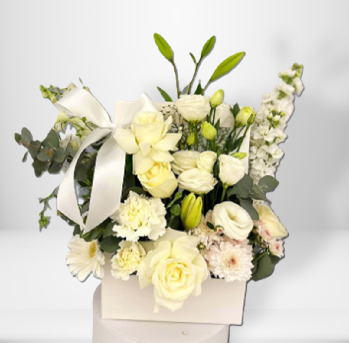 Express your heartfelt support with our Whisper of Peace Carry Box Arrangement, thoughtfully designed to bring comfort and calm during challenging times. This beautifully presented collection of soft, soothing blooms symbolises a quiet embrace of care and compassion when it’s needed most.